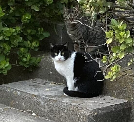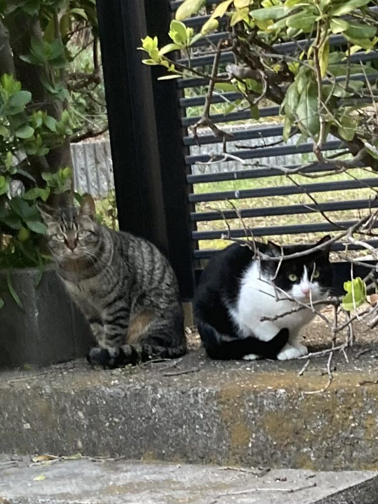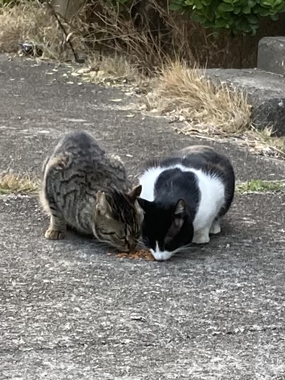 なんと以前にいた黒のトラ猫(サバトラ猫)も一緒にいるではないですか! 先日、クロちゃんにエサをあげに来られている女性の方から「鯖猫も帰って来たよ」と聞いていたのです。 この猫も似ているのですが違う猫でした。 2匹はとても仲が良くて寄り添っていましたので、飼い主が一緒に飼われていた猫達を公園に捨てに来たのかもしれません。 公園にはクロちゃんの1匹しかいませんでしたので、一気に賑やかになりました。 嬉しいやら、複雑な気持ちです。